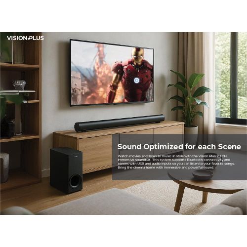 Watch movies and listen to music in style with the Vision Plus 2.1 CH Immersive soundbar. This system supports Bluetooth connectivity and comes with USB and audio inputs so you can listen to your favourite songs. Bring the cinema home with immersive and powerful sound..